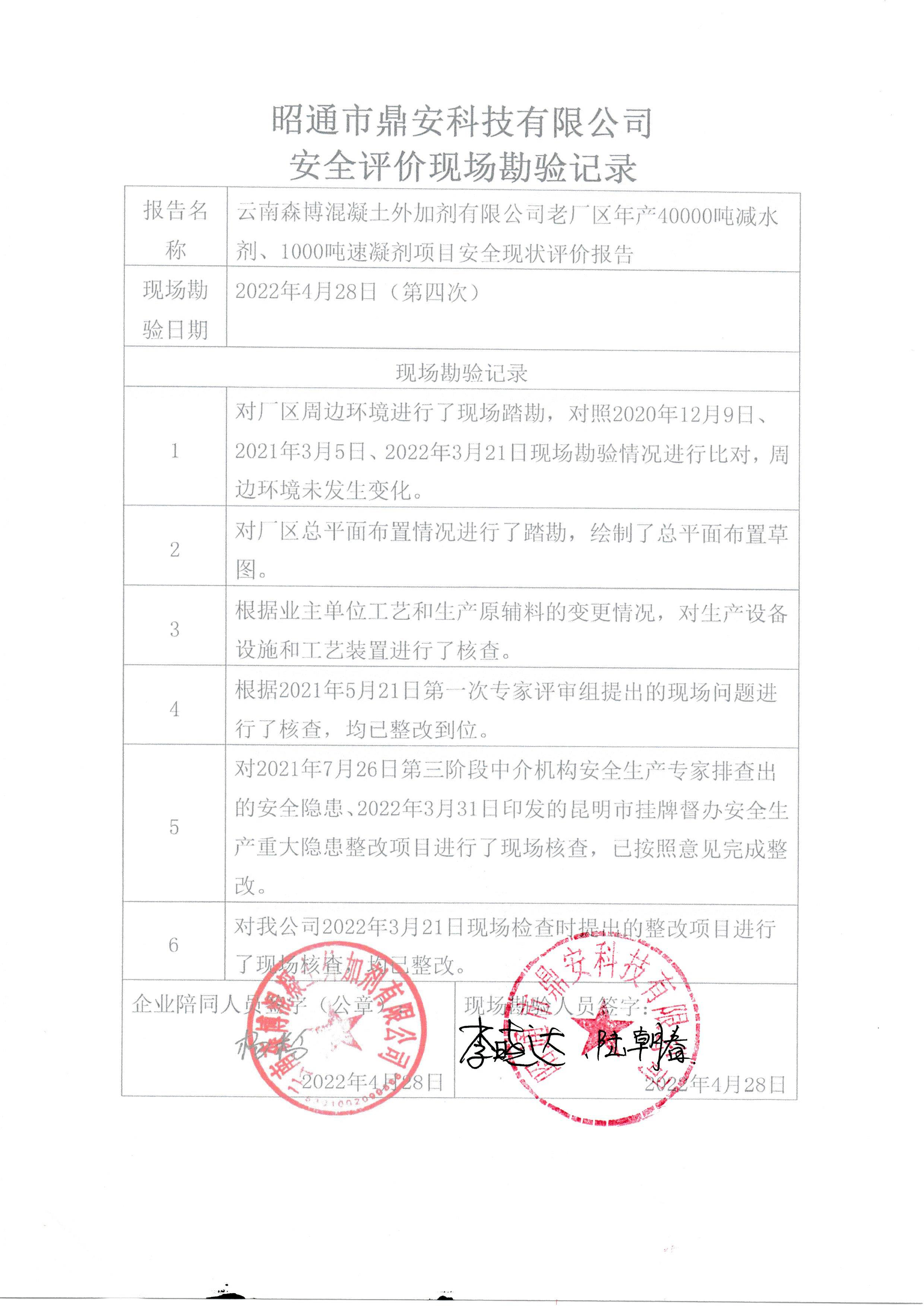 項目名稱 | 云南森博混凝土外加劑有限公司老廠區(qū)年產(chǎn)40000噸減水劑、1000噸速凝劑項目安全現(xiàn)狀評價報告 | 合同編號 | DAKMAP2022-30 | |||||